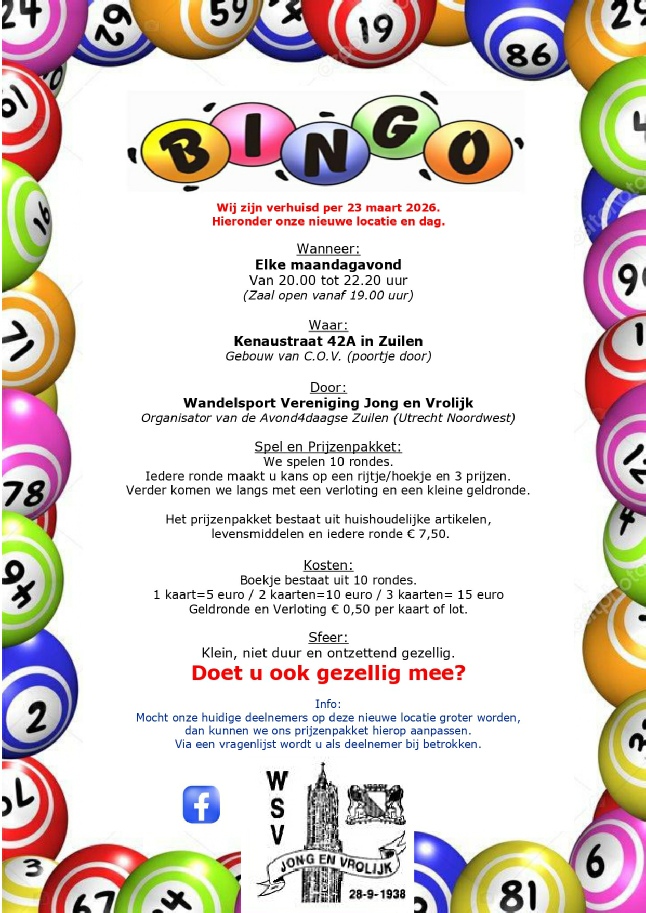 In de week van onze Avond4daagse Zuilen en met kerst is er géén bingo.